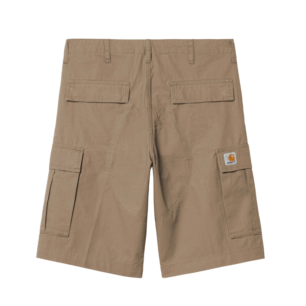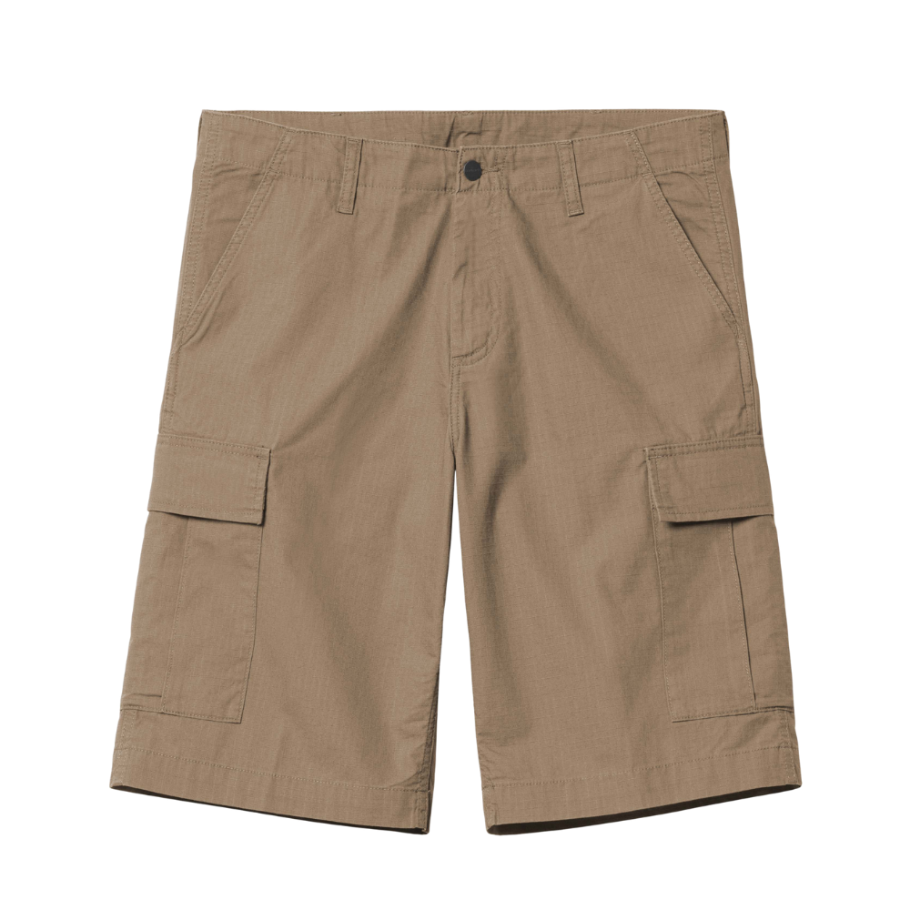 The Regular Cargo Short is constructed from a lightweight cotton ripstop fabric. This robust cotton has been rinsed for added comfort without sacrificing its durable qualities. Features multiple pockets and a woven Carhartt WIP label on the right leg pocket.