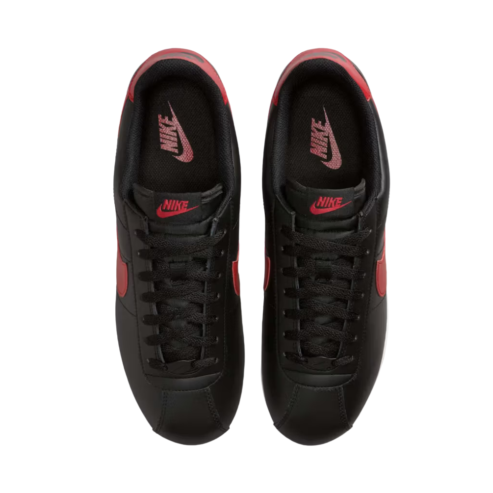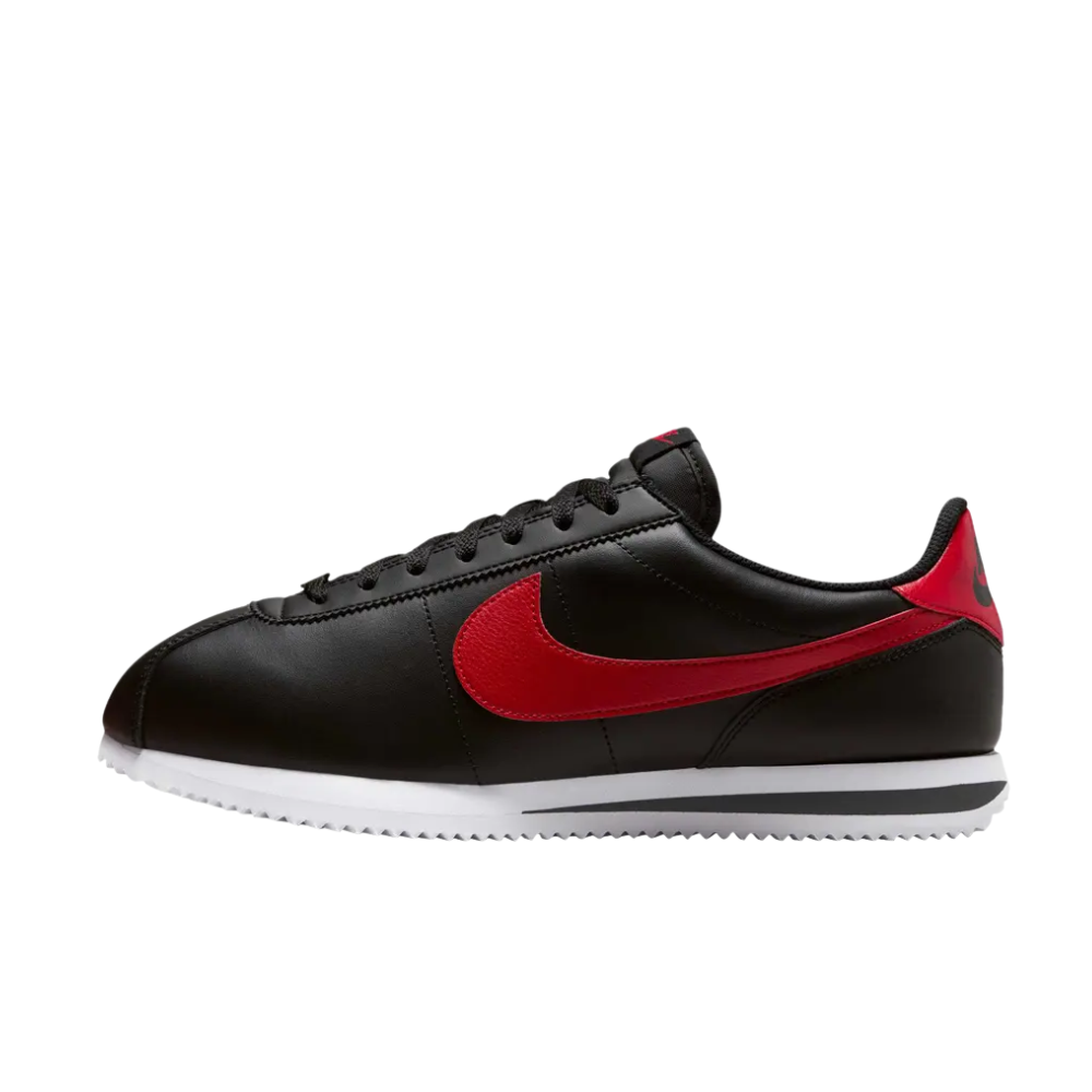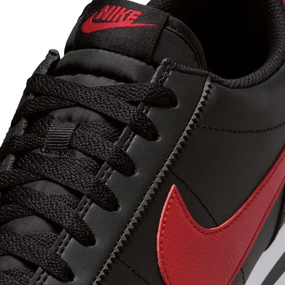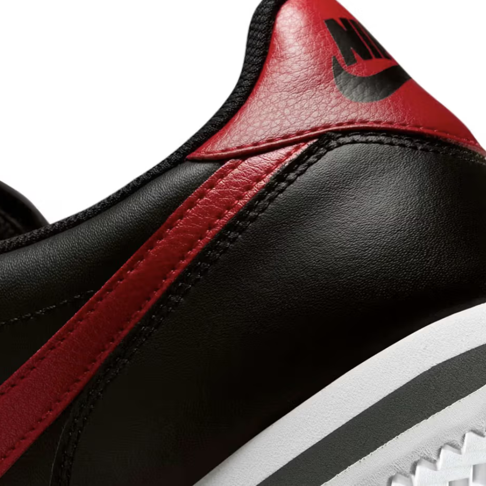 The model features the classic “Bred” colorway with a black leather base and contrasting stark red hues on the panel swoosh and heel. This combination also lands on the other branding details, including the tongue tag, insoles and stamped Nike heel logo. To keep it simple, the shoe rests on a white midsole with a gray streak and a white herringbone outsole. Black laces tie it together for a cohesive finish.